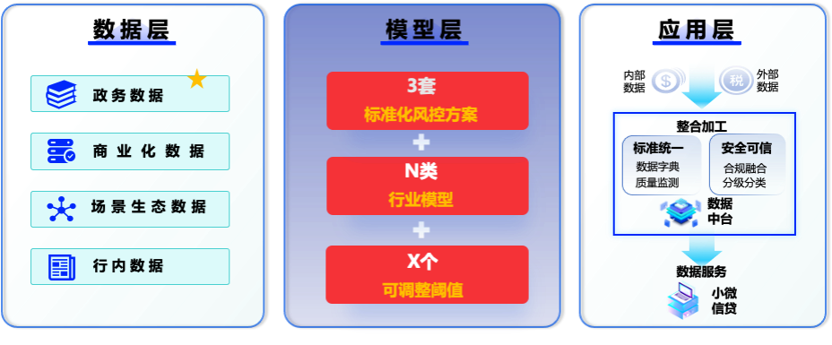 三是科学建立组件化风险评估方案。应用人工智能与大数据技术,融合监督学习(逻辑回归、随机森林、时间序列分析)、无监督学习(DBSCAN、K-Means)算法、特征工程与自适应阈值优化等技术,构建“3套标准化风控方案”+“N类行业模型”+“X个可调阈值”的“3+N+X”普惠金融标准化风险评估体系。以标准化方案作为底座,依据行业偏好、属地特色等细分属性,通过“搭积木”的方式打造“多模型组合”,实现风险底线统一化、行业风控差异化、区域客群配置化。