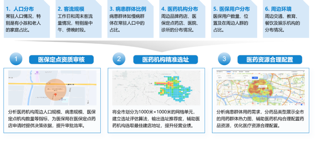 二是依托多技术手段实现数据标准化处理与多维度挖掘。一方面通过自助分析、标签库等大数据平台工具组件,对采集的数据进行清洗、整合和转换,确保数据准确性、完整性和一致性。另一方面,运用大数据技术和机器学习算法,对数据进行多维度分析和挖掘,建设热力分布、选址推荐、价格比对、虚假就医识别等多个核心能力,并按照数据的分类分级,将其封装成SaaS、API、小程序、大数据报告等服务模式,提供医药机关选址、医保服务宣传、药品价格监测、医保反欺诈等服务。