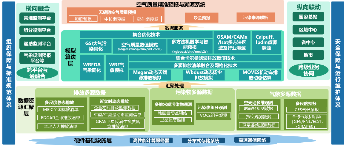 一是广泛采集多维数据。通过互联网采集、用户提供等方式,汇聚气象、污染、排放等18类多空间维度、多物种维度、多时间维度数据。同时,基于空天地多维气象观测数据及不同时间尺度的全球气象预报结果、多维度多要素的污染观测数据、动静结合的多尺度大气污染排放数据,应用数据同化、反演评估、数值模拟、机器学习、集合优化、溯源模拟等算法,实现空气质量精准预报与溯源,为大气污染防治提供科学、精准支撑。