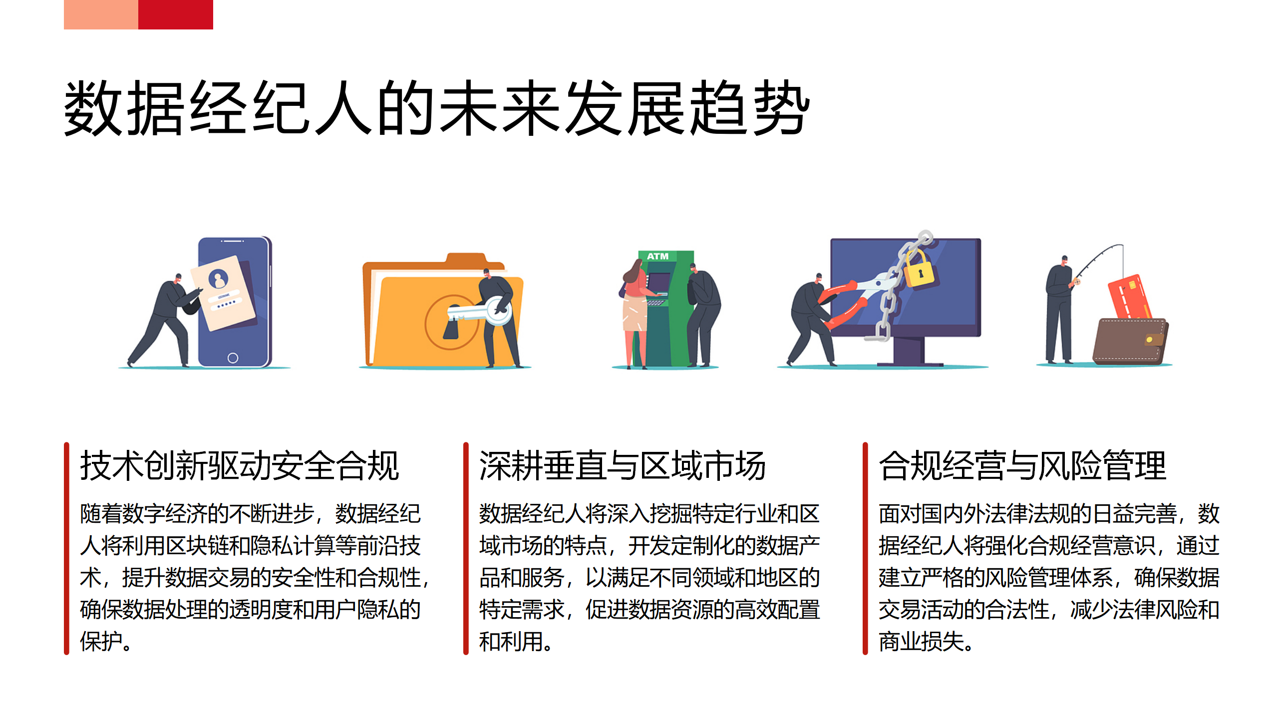 《数据经纪人 基本技能和发展路径》课程旨在引导学员深入理解数据经纪人的核心价值和运营模式,并详细探讨数字经济背景下数据经纪人的挑战与机遇。课程将详细解析数据经纪人在数据采集、处理、分析和交易等关键环节中的操作模式,并构建多维认知体系。