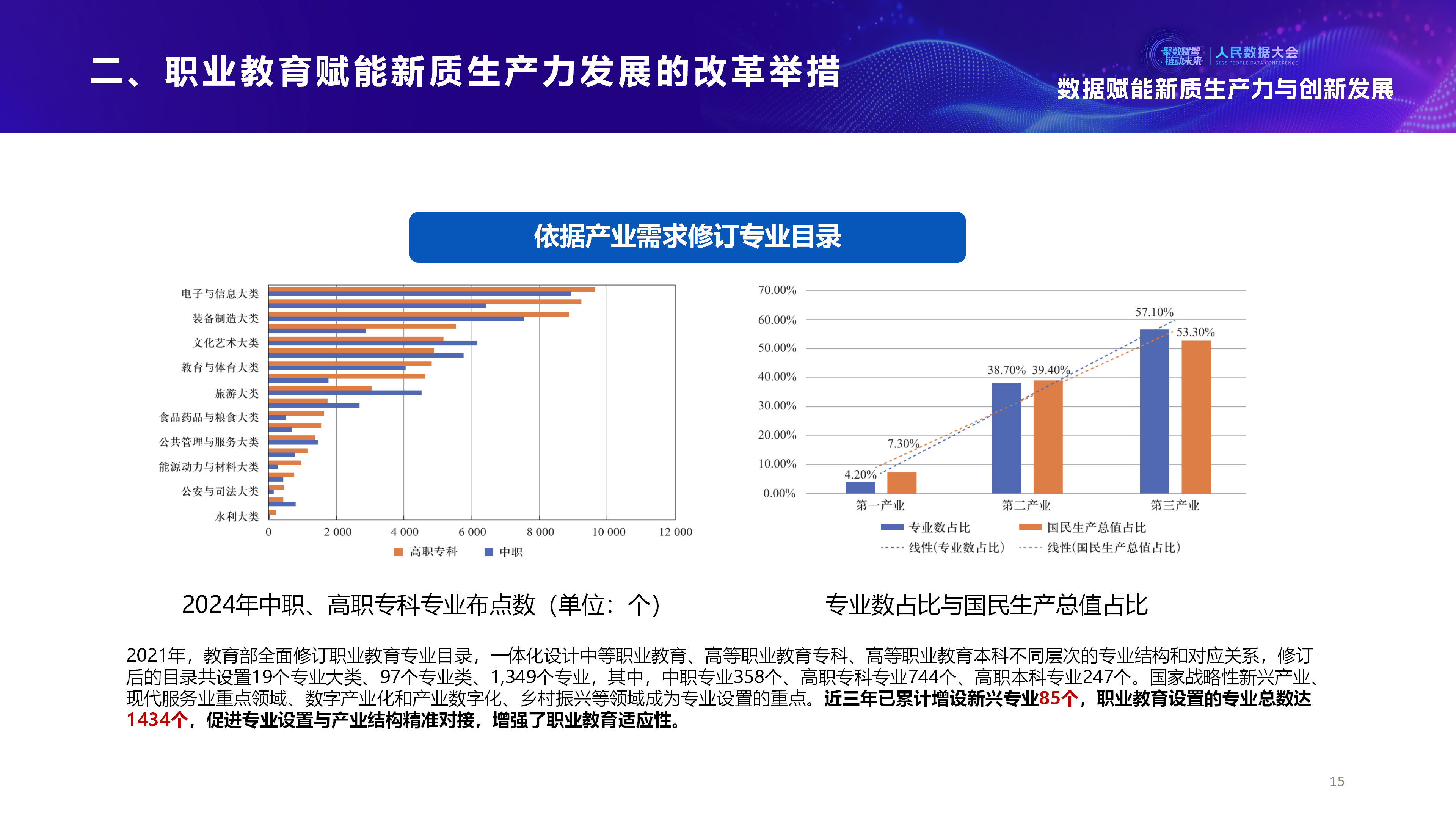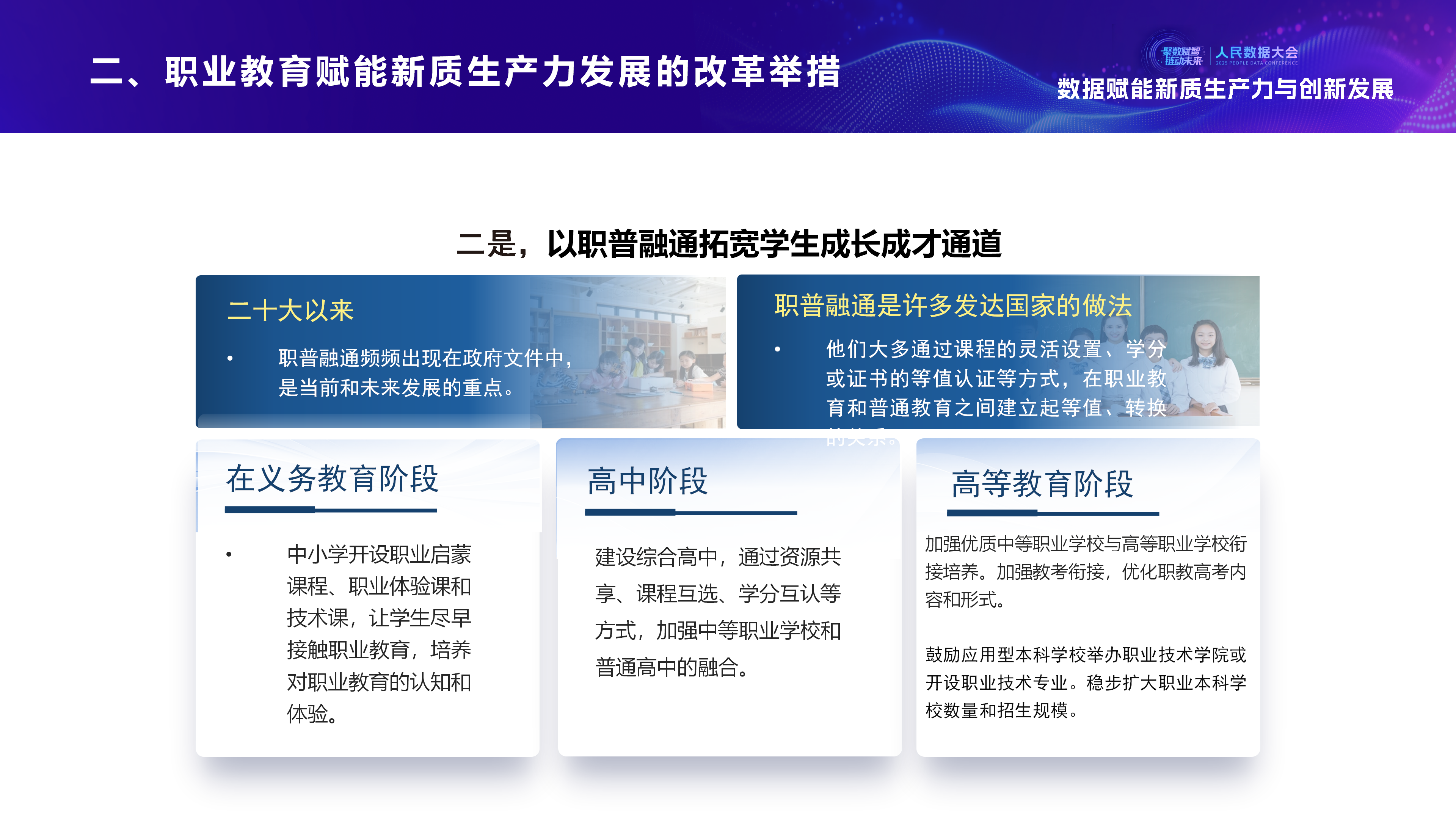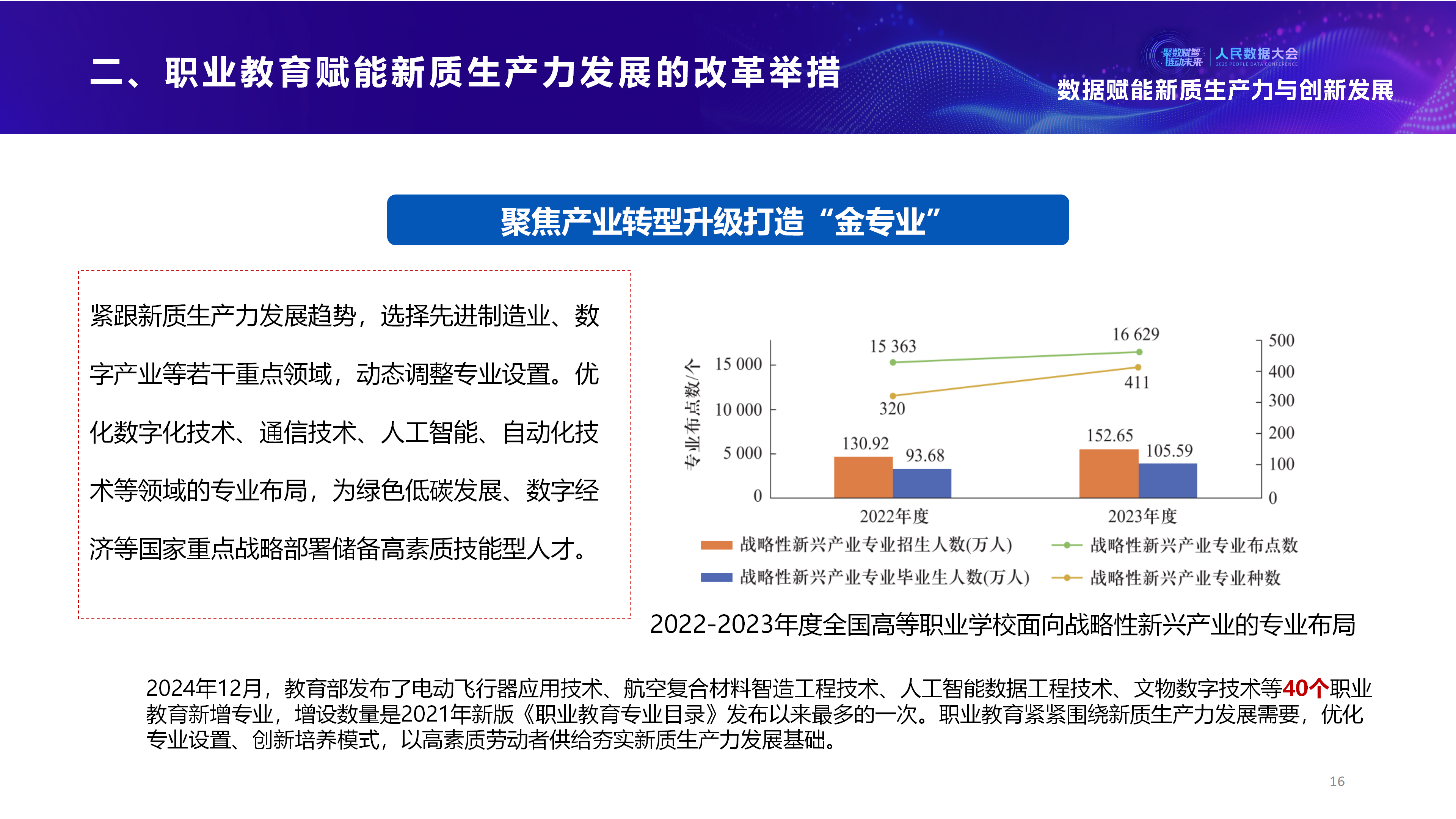 在2025人民数据大会“数据赋能新质生产力与创新发展”平行论坛上,教育部职业教育发展中心战略发展处副处长苏敏围绕塑造多元办学、产教融合新形态,加快推进职普融通,扩宽技术技能人才成长通道;持续提升职业学校关键办学能力,等方面展开讲述。